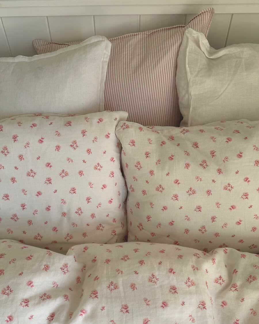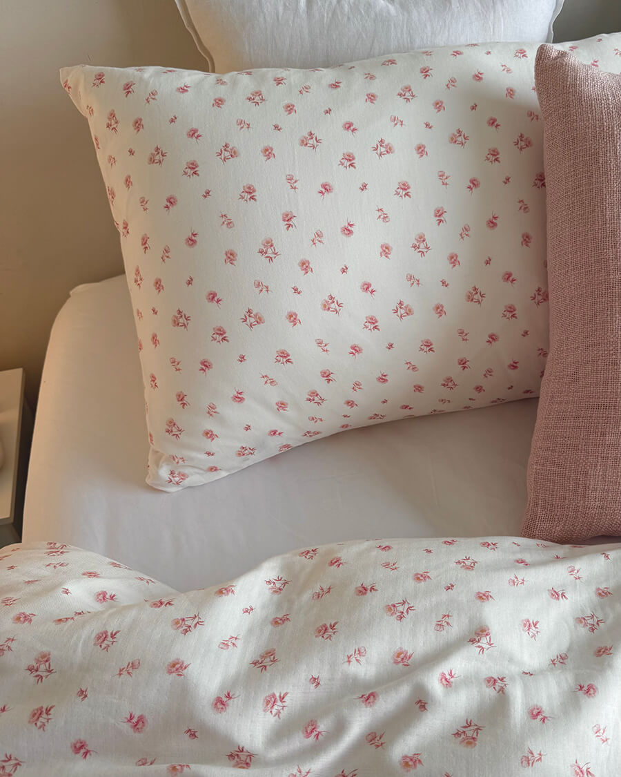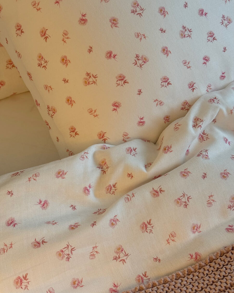 Our Peony duvet cover set is made from cotton muslin, a soft, breathable fabric that keeps you cool and comfortable through the night. The set includes a duvet cover with button closure and two standard pillowcases, featuring our peony print in a soft, dusty pink tone. Single sets include one pillowcase.