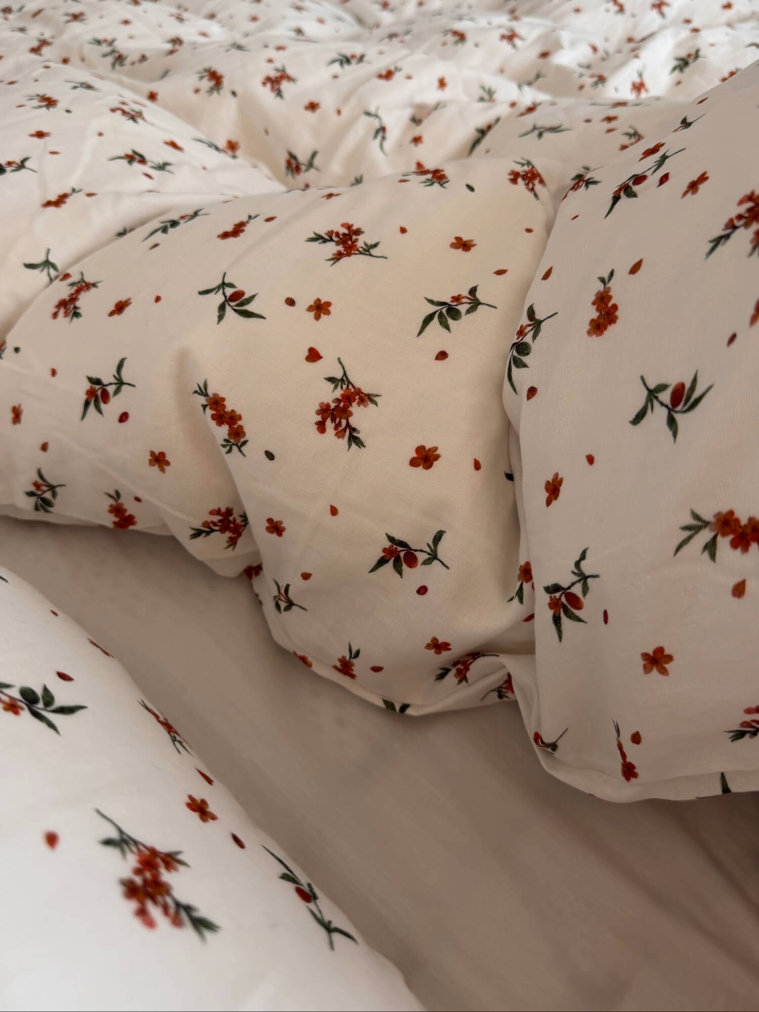 Our Madinia duvet cover set is made of cotton muslin, a lightweight and breathable fabric that is perfect for keeping you cool and comfortable while you sleep. The set includes a duvet cover (button closure) and two pillowcases with our Madinia print. Single sets include one pillowcase.