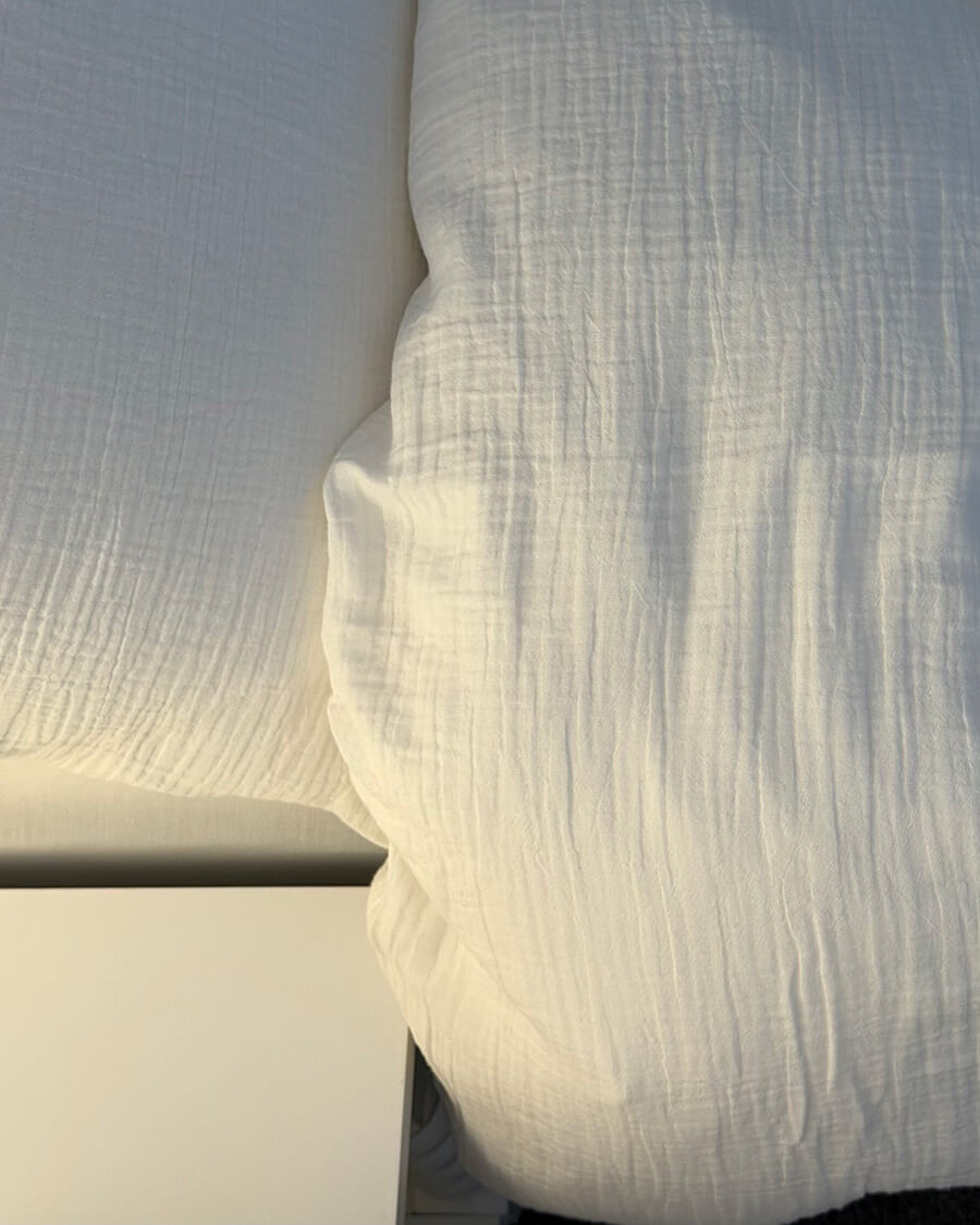 Our duvet cover set is made of cotton muslin, a lightweight and breathable fabric that is perfect for keeping you cool and comfortable while you sleep. The set includes a duvet cover (button closure) and two standard pillowcases. Single sets include one pillowcase.