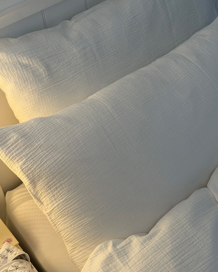 Our pillowcases are made of cotton muslin, a lightweight and breathable fabric that is perfect for keeping you cool and comfortable while you sleep. Comes with two pillowcases.
